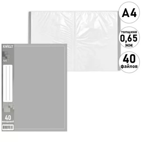 Папка 40файлов " KWELT " А4 Classic серая, пластик 0,65мм, бумажная вставка во внешний кармашек, индивидуальный штрихкод