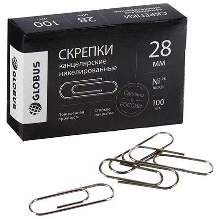 Скрепки " Глобус " 28мм никелированные 100шт, картонная упаковка