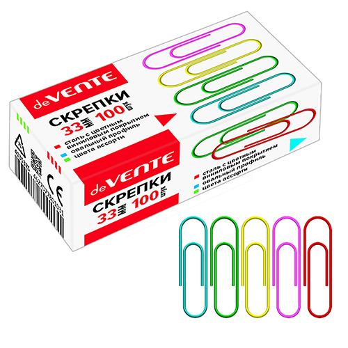 Скрепки " deVente " 33мм металлические цветные 100шт картонная коробка