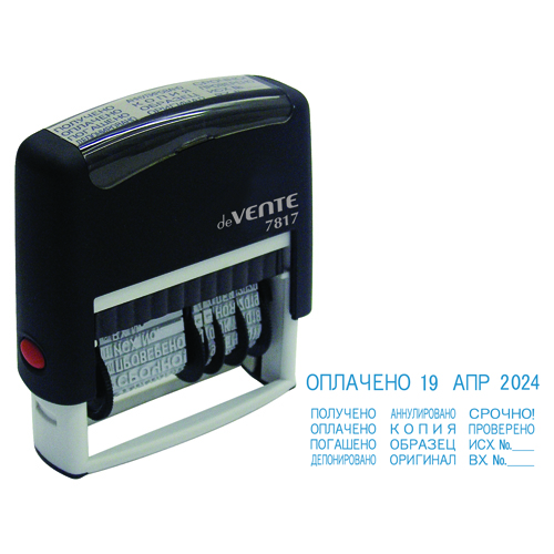 Датер автоматический " deVente " 7817 высота шрифта 4мм, с 12 бухгалтерскими терминами, месяц буквами, покрытие Soft touch, пластиковый, в блистере