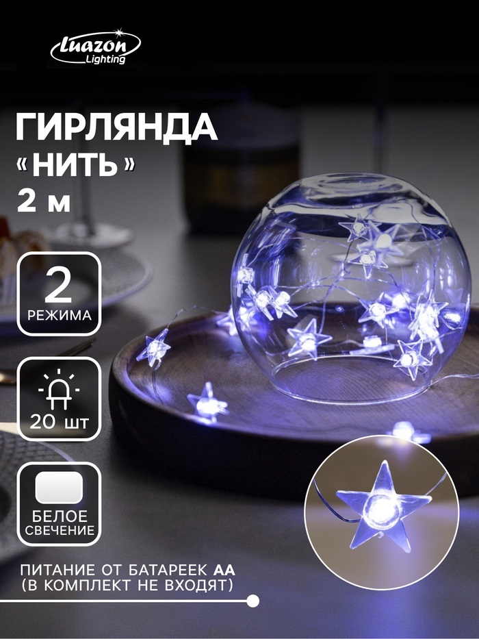 НИТЬ ROSA DECOR "Звезда", IP20, 2 м, Н.С. 20 LED, AAx2 (не в компл), 2 р., БЕЛЫЙ 7867182
