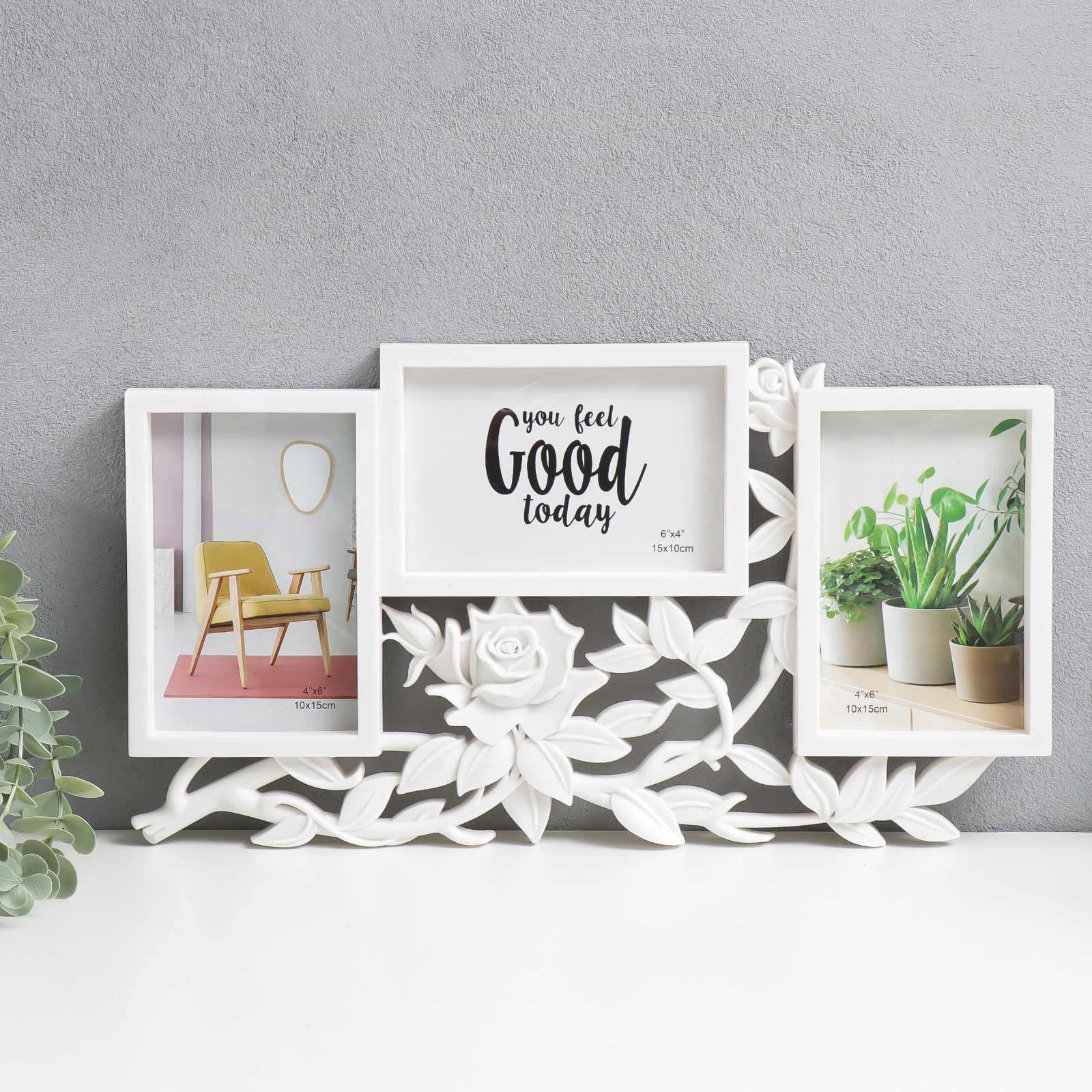 Фоторамка пластик на 3 фото 10х15 см "Роза в листьях" белая 40х21,5 см 9068896