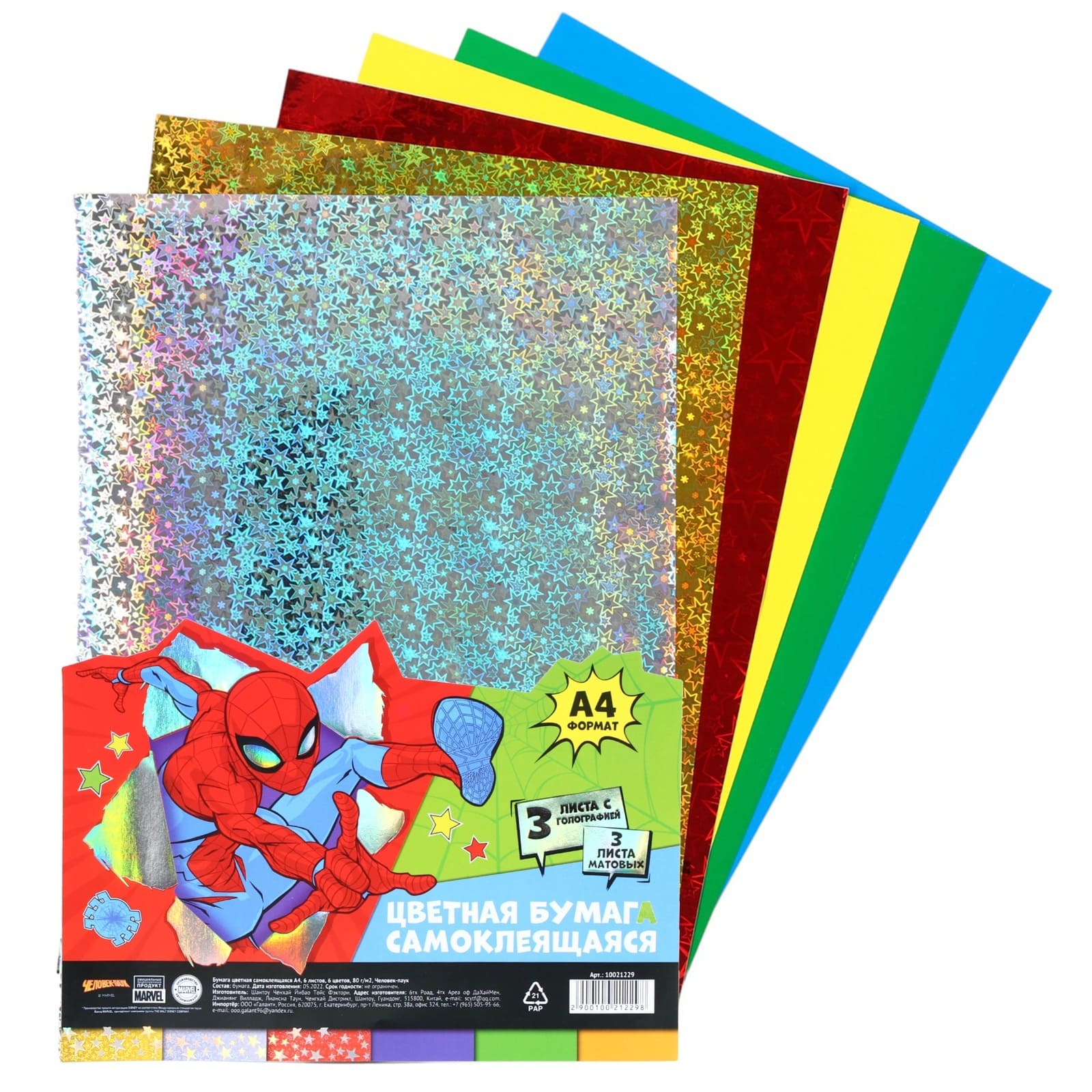 Бумага цветная самоклеящаяся А4, 6 листов, 6 цветов, 80 г/м2, Человек-паук 10021229
