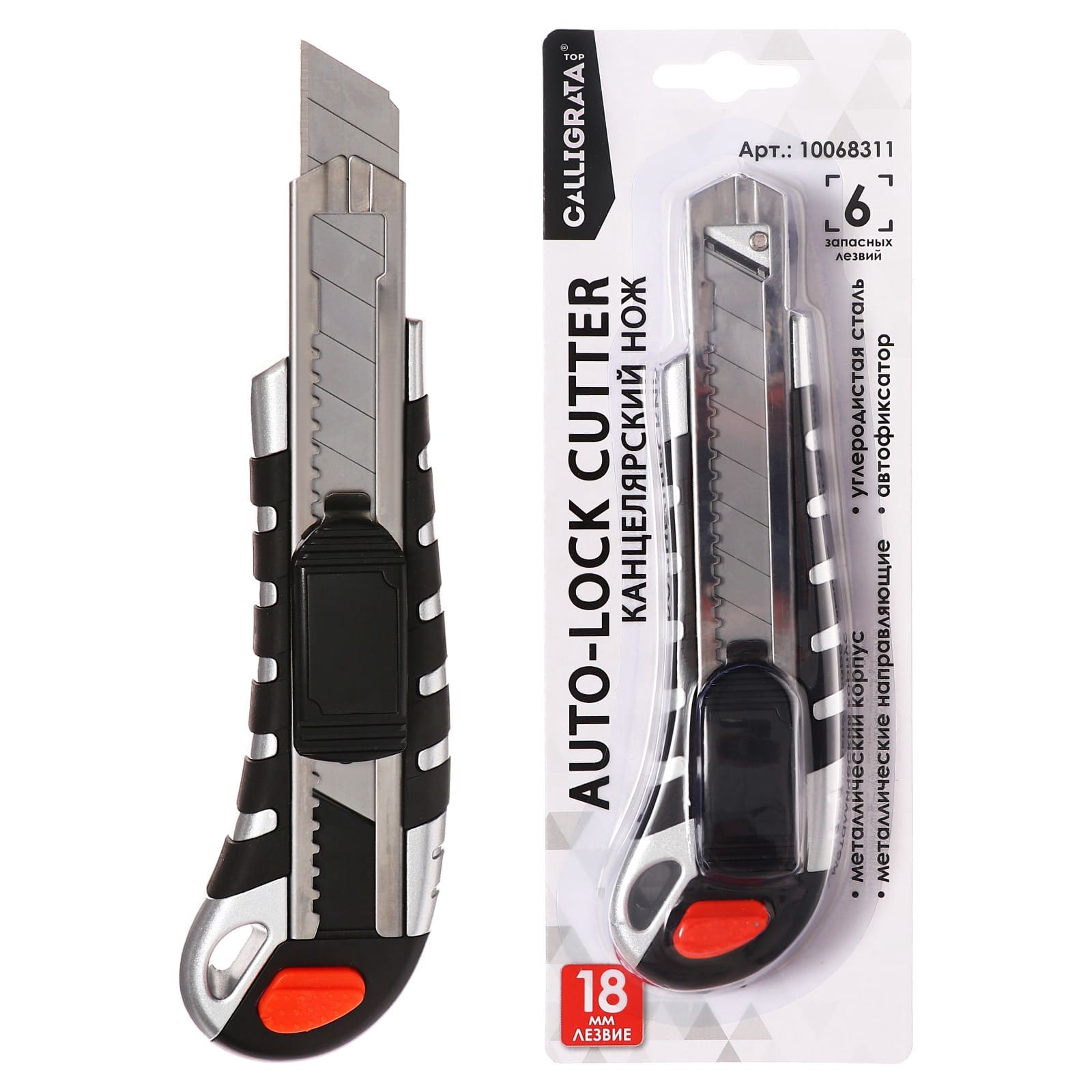 Нож канцелярский 18мм металлический, 6 штук лезвий, Zinc-alloy, металл направляющие, TOP 10068311