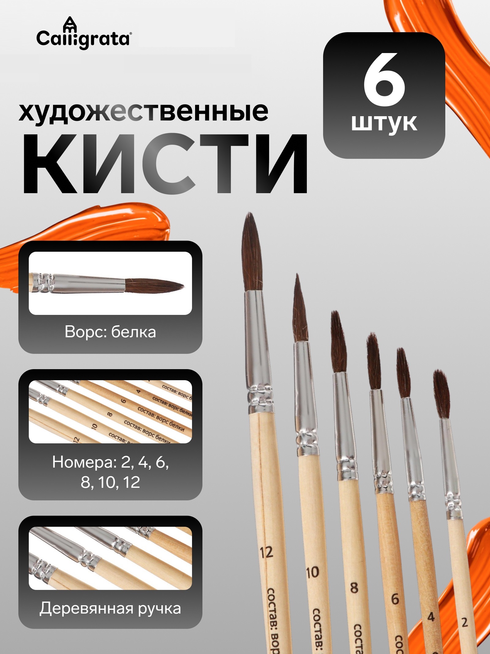 Набор кистей белка круглые 6 штук (№2,4,6,8,10,12) с дерев.ручками (межд.разм) 10212698