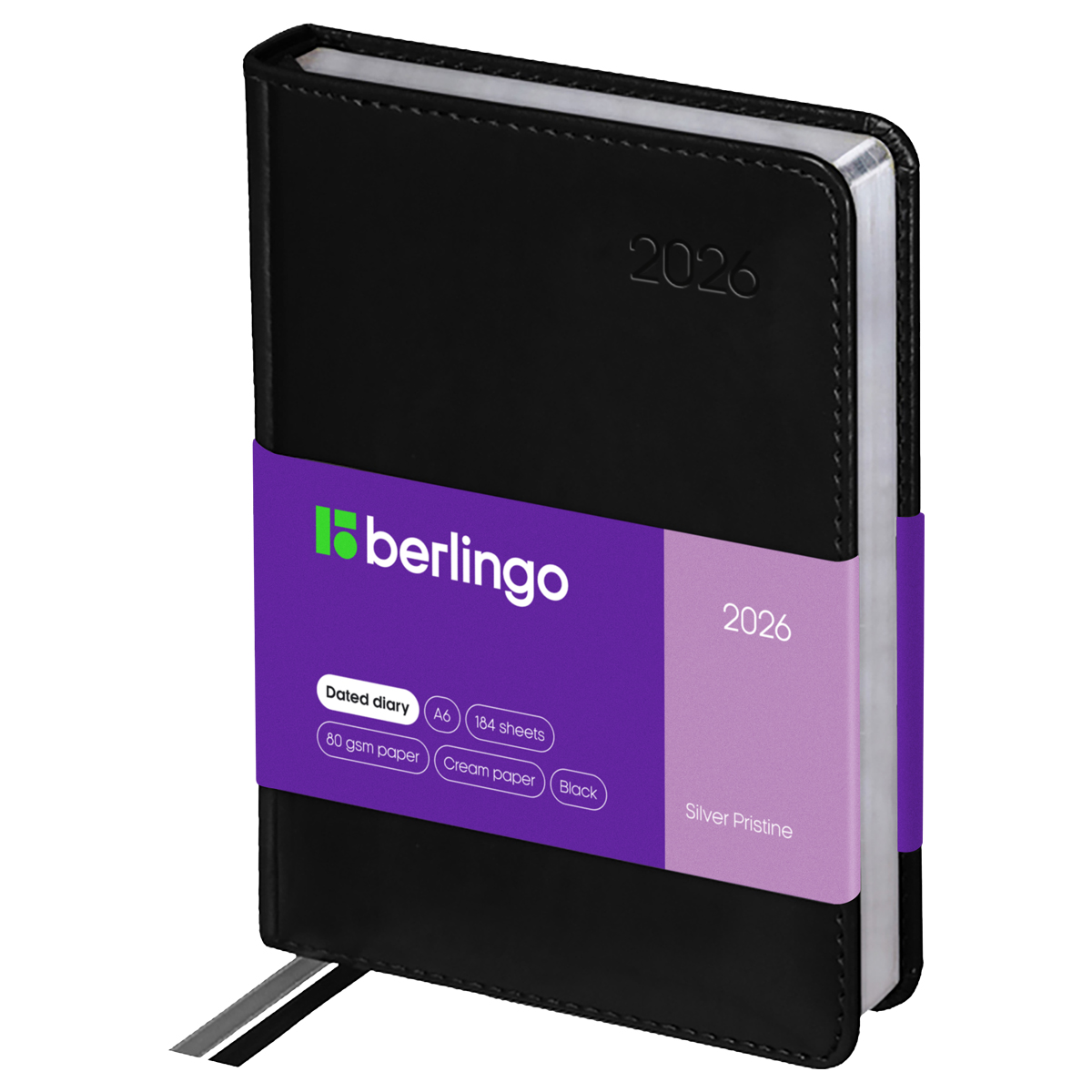 Ежедневник датированный 2026г., А6, 184л., кожзам, Berlingo "Silver Pristine", сер. срез, черный