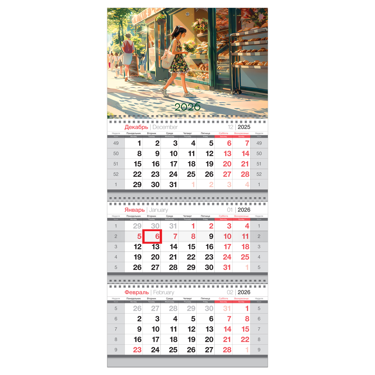 Календарь квартальный 3 бл. на 3 гр., 295*660 мм BG "Солнечная улица", с бегунком, 2026г.