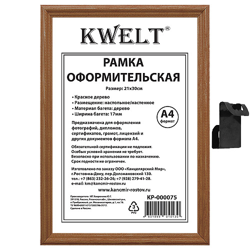 Фоторамка " KWELT " деревянная (МДФ) А4 21*30см красное дерево, стекло, сосновый багет, ширина багета - 9мм