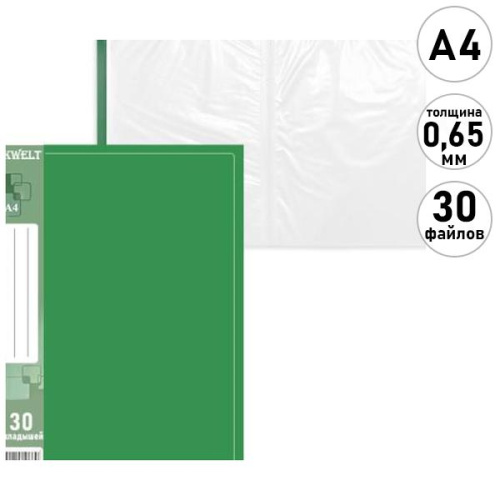 Папка 30файлов " KWELT " А4 Standart зеленая, пластик 0,65мм, бумажная вставка во внешний кармашек, индивидуальный штрихкод