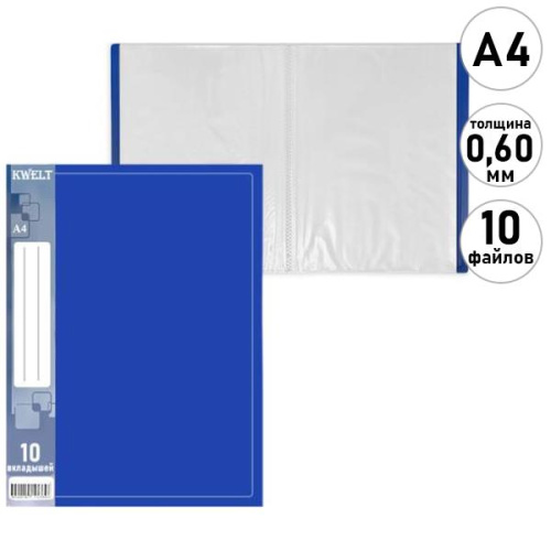 Папка 10файлов " KWELT " А4 Standart синяя, пластик 0,6мм, бумажная вставка во внешний кармашек, индивидуальный штрихкод