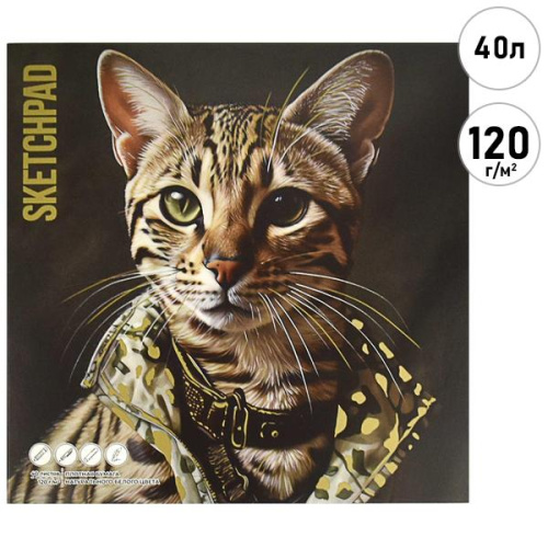Скетчпад, белая бумага 120г/м2, 170*170мм, 40л, без линовки, обложка - мелованный картон, склейка, откидная планка, " Феникс " Стильный кот