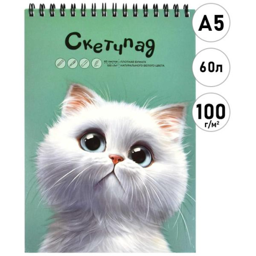 Скетчпад, белая бумага 100г/м2, А5, 140*200мм, 60л, спираль, без линовки, обложка - мелованный картон, выборочный УФ-лак " Феникс " Мечтающий кот