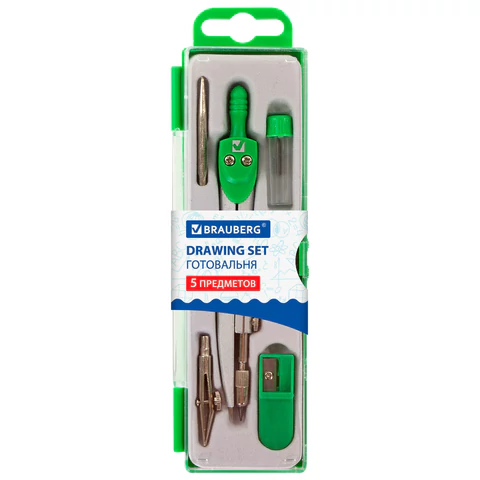 Готовальня BRAUBERG "Klasse", 5 предм: циркуль 125мм, 2 вставки,грифель,точилка,пенал с подв,210336