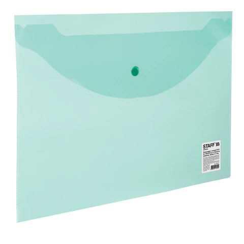 Папка-конверт с кнопкой STAFF, А4, до 100 л, прозрачная, зеленая, 0,12 мм, 225171