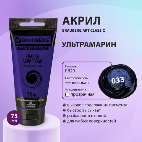Краска акриловая художественная BRAUBERG ART CLASSIC, туба 75мл, УЛЬТРАМАРИН, 191095