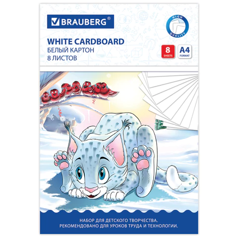 Картон белый А4 немелованный, 8 листов, в папке, BRAUBERG, 200х290мм, Барсик 1, 129902