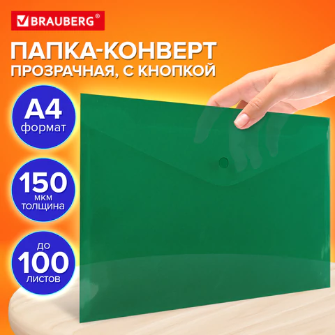 Папка-конверт с кнопкой прозрачная А4 BRAUBERG UNIVERSAL, до 100 листов, зеленая, 0,15 мм, 273074