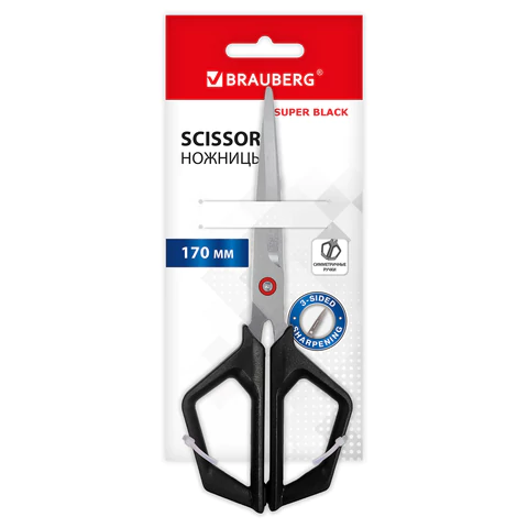 Ножницы BRAUBERG "Super black" 170 мм, черные, 3-х сторонняя заточка, ручки из ABS пластика, 238854