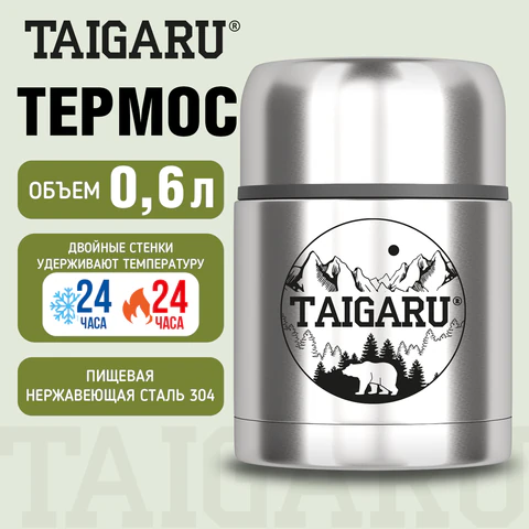 Термос 0,6л для еды/напитков с широким горлом, нерж. сталь SUS304, TAIGARU FOOD, серебристый, 700324