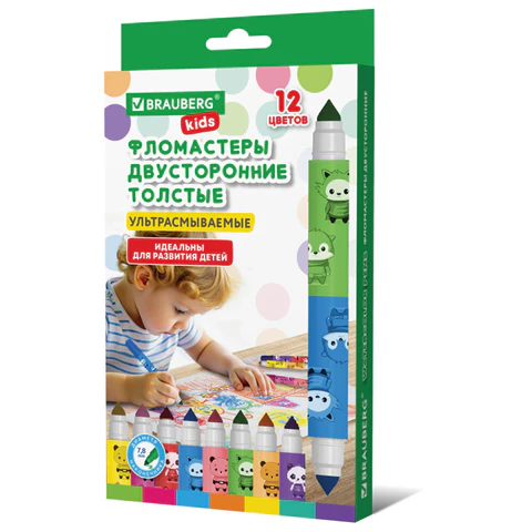 Фломастеры двусторонние толстые для малышей ультрасмываемые 6 штук/12 цветов, BRAUBERG KIDS, 152625