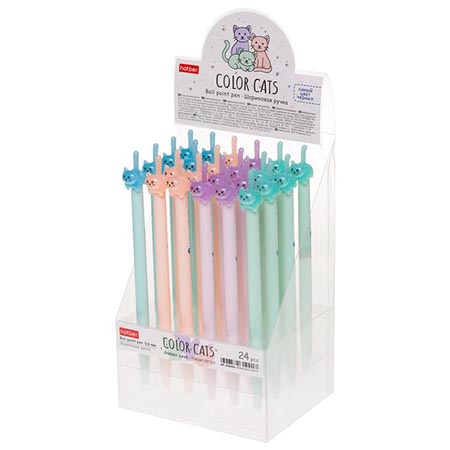 Ручка шариковая автоматическая " Hatber " Cats синяя 0,6мм игольчатый пишущий узел, чернила на маслянной основе, непрозрачный пластиковый корпус, с фигуркой кошки, ПВХ-боксе