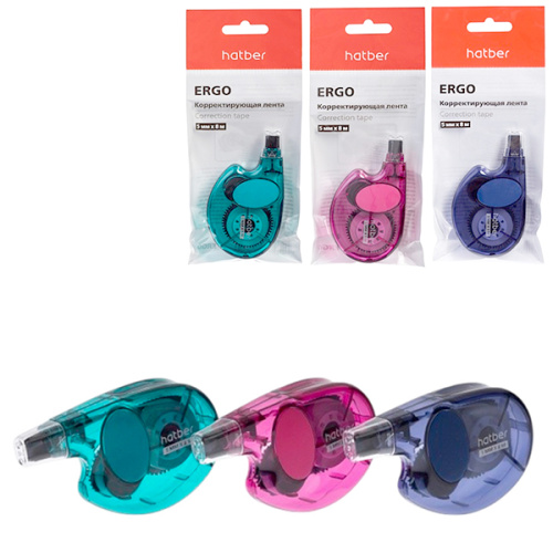 Корректирующая лента " Hatber " Ergo 5мм*8м, ассорти, пакет, европодвес