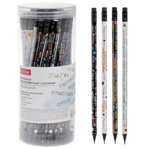 Карандаш ч/гр " Hatber " Правописание НВ ассорти, с ластиком, круглый, деревянный, цвет корпуса- ассорти, заточенный, в пластиковой тубе