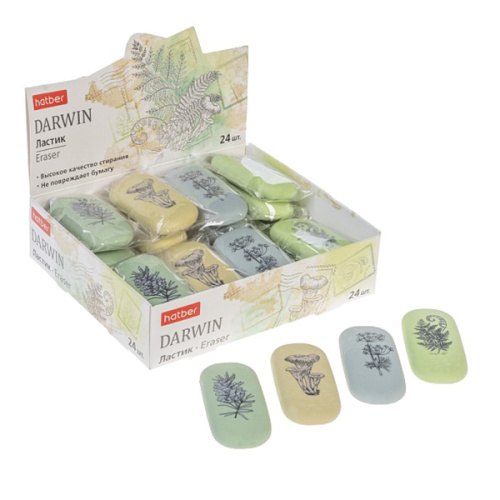 Ластик " Hatber " PVC Дарвин, из термопластичной резины, 24шт, ассорти, овальный, индивидуальная упаковка, картонный дисплей