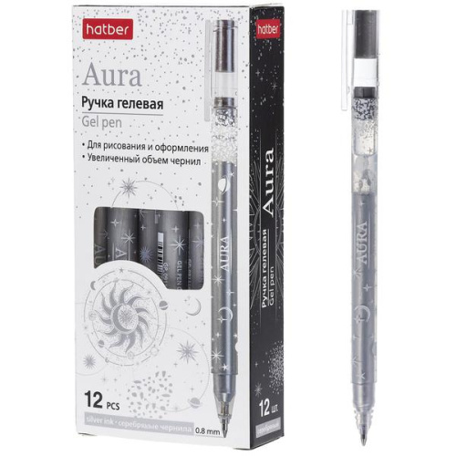 Ручка гелевая " Hatber " Aura серебряная 0,8мм, прозрачный пластиковый корпус, картонная упаковка