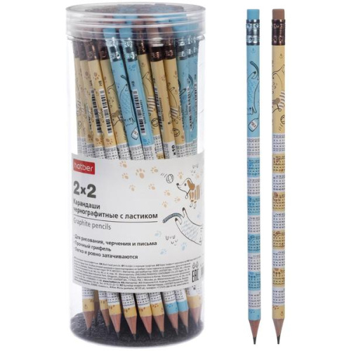 Карандаш ч/гр " Hatber " 2х2 НВ с ластиком, ассорти, круглый, заточенный, пластиковая туба