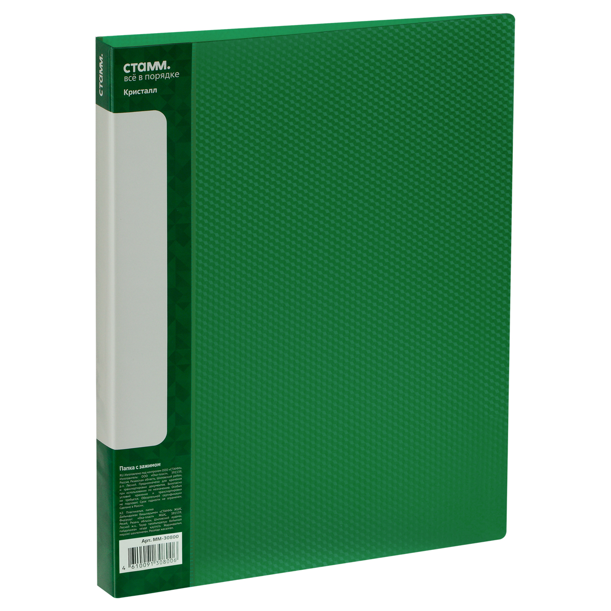 Папка с боковым зажимом СТАММ "Кристалл" А4, 17мм, 700мкм, пластик, зеленая