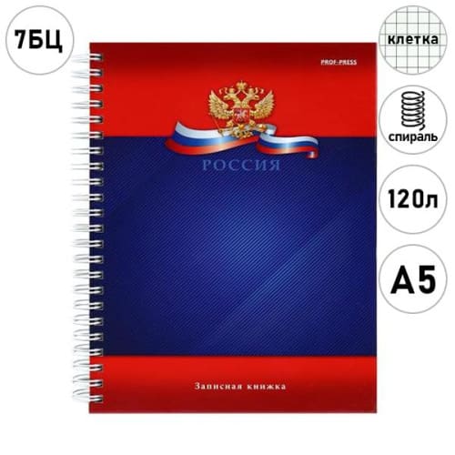Записная книжка А5 7БЦ спираль 120л " Проф-Пресс " Символика России-5, клетка, обложка - глянцевый ламинированный картон