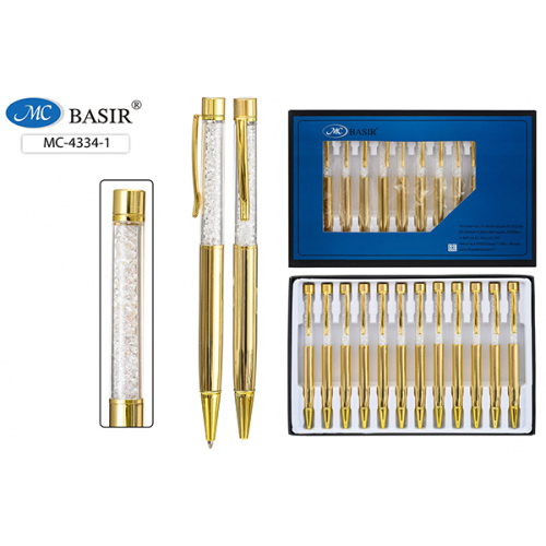 Ручка шариковая " Basir " синяя 0,7мм металлическая, поворотный механизм, комбинированный корпус-нижняя часть корпуса золото, прозрачная часть корпуса с наполнителем- стразы