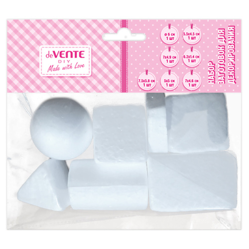 Набор пенопластовых заготовок " deVente " Геометрические фигуры, в наборе: шар d=6см 1шт, пирамида 5,5*4,5см 1шт, куб 5см 1шт, прямой параллелепипед 7*4,9см 1 шт, пятиугольная призма 6,2*1,4см 1 шт, цилиндр 7*4,6см 1 шт, наклонный параллелепипед 7,5*5,8*4,5см 1 шт, пакет, европодвес