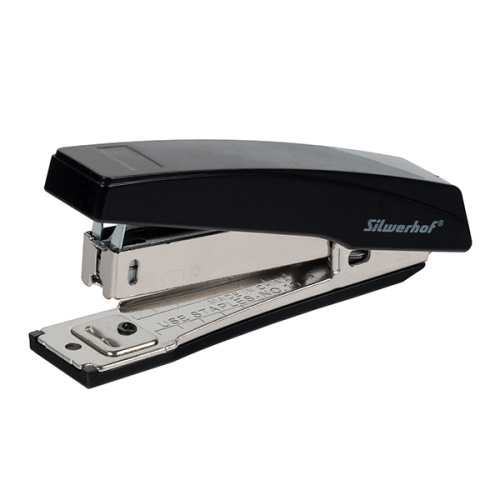 Степлер Eco №10 на 15л " Silwerhof " 50скоб пластик/металл, встроенный антистеплер, один режим скрепления скоб, глубина закладки бумаги 50мм, черный, картонная упаковка