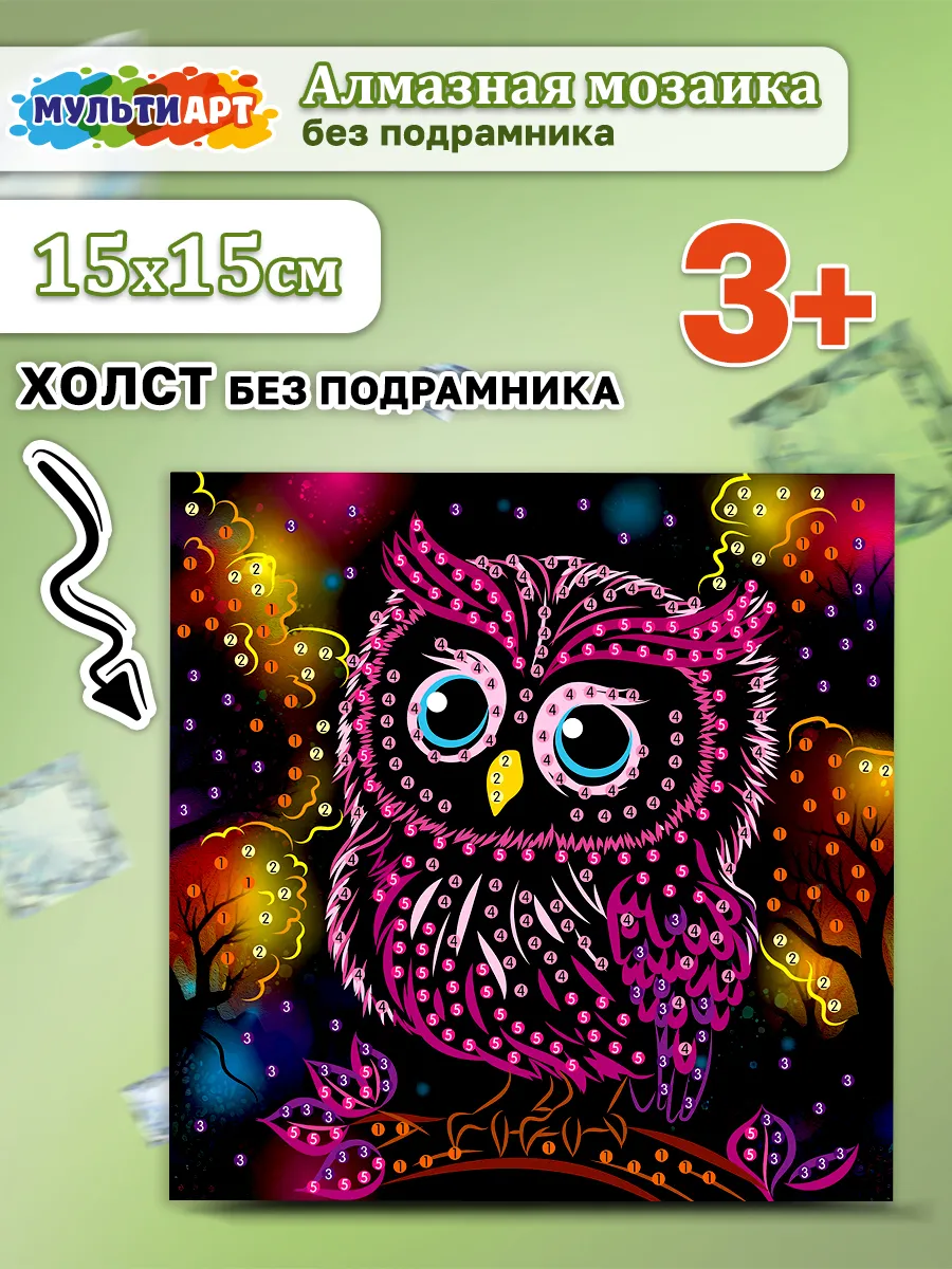 Алмазная мозаика на черном фоне 15*15, в корокбе, совёнок МУЛЬТИ АРТ в кор.48шт