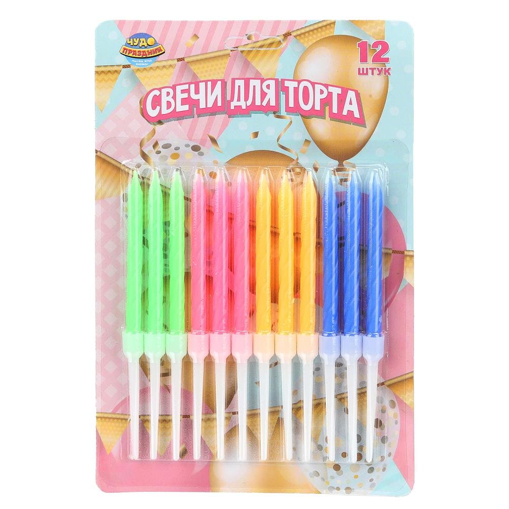 Свечи для торта с держателем четыре цвета, 12шт, СС12-113347-HB7 блистер, воздушные шары ЧУДО ПРАЗДНИК в кор12*24наб