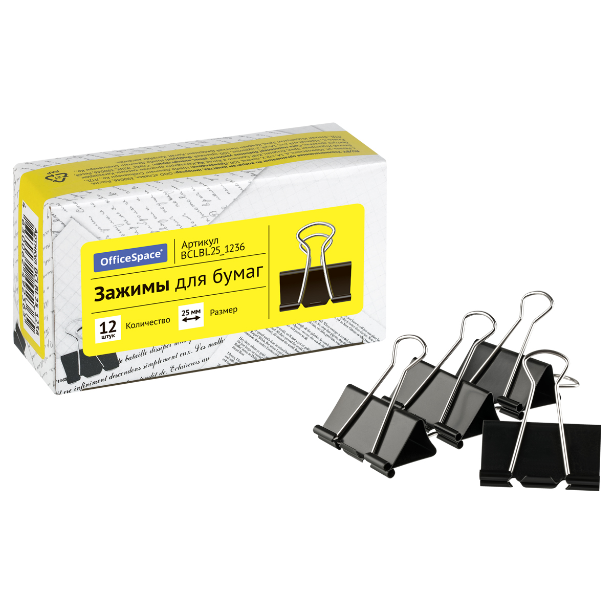 Зажимы для бумаг 25мм, OfficeSpace, 12шт., черные, картонная коробка