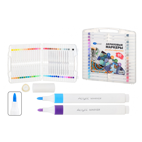 Набор маркеров акриловых " Basir " 60цв, 4мм, пулевидный наконечник, в пластиковом боксе