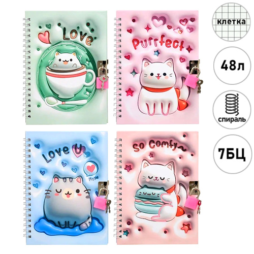 Блокнот 18*13см на замочке 7БЦ 48л " Basir " Кошки, клетка, 3D рисунок, спираль, 4 дизайна (без возможности выбора)