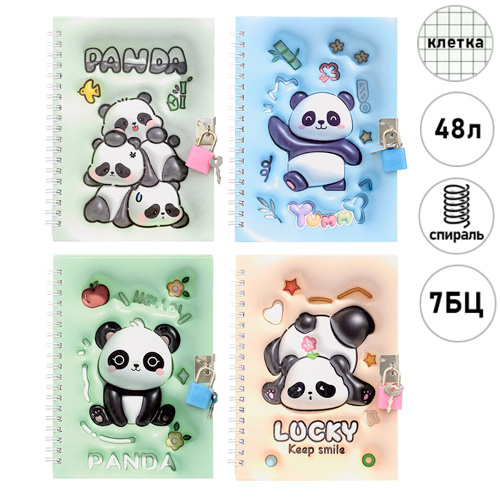 Блокнот 18*13см на замочке 7БЦ 48л " Basir " Панда, клетка, спираль, обложка с 3D рисунком, ассорти 4 дизайна (без возможности выбора дизайна)