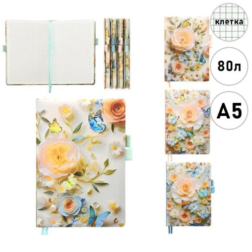 Блокнот А5 искусственная кожа 80л " Basir " Цветы бабочки (ассорти), клетка, сшивка, обложка с рисунком, тиснение, 2 резинки для ручки, 2 ляссе, 4 дизайна