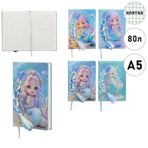 Блокнот А5 80л " Basir " Русалка (ассорти), 210*145мм, клетка, обложка - матовая ламинация, рисунок с косой из искусственного волоса, поролон, сшивка, ляссе, 4 дизайна