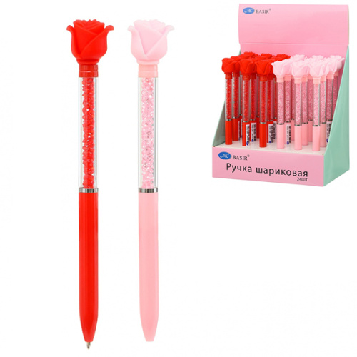Ручка шариковая автоматическая " Basir " Розы, синяя 0,5мм, поворотный механизм, комбинированный корпус: цветной (ассорти), прозрачная часть корпуса с наполнителем-цветные стразы, наконечник - роза, дисплей
