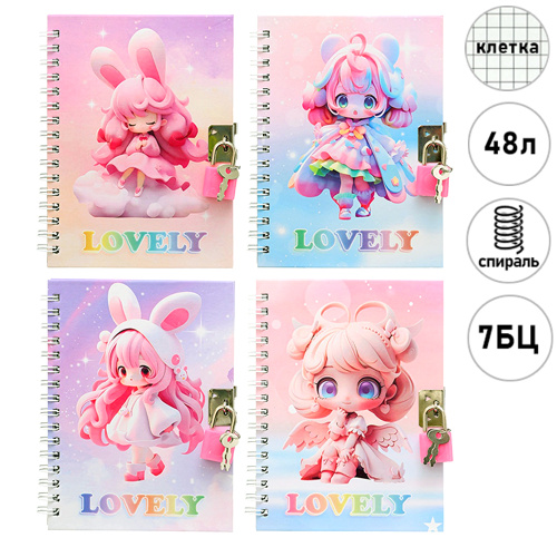 Блокнот 15*11см на замочке 7БЦ 48л " Basir " Девочка-Lovely, клетка, спираль, 4 дизайна (без возможности выбора)