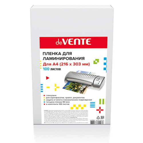 Пленка для ламинирования " deVente " А4 0,09мм, глянцевая, 100л, 216*303мм