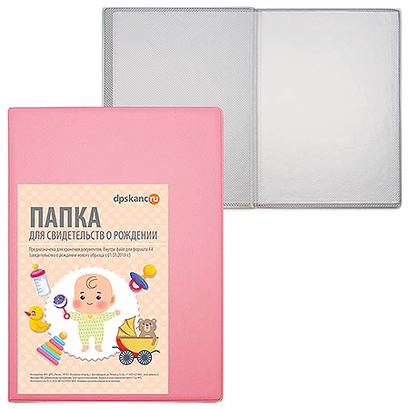 Папка для свидетельства о рождении А4 " ДПС " светло-розовая, 160*229мм, размер файла 222*314мм, ПВХ, нового образца (с 2019 года)
