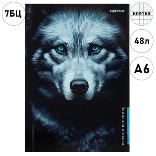 Записная книжка МАЛЫЙ ФОРМАТ А6 7БЦ 48л " Проф-Пресс " Волк на черном, клетка, обложка - глянцевый ламинированный картон, сшивка