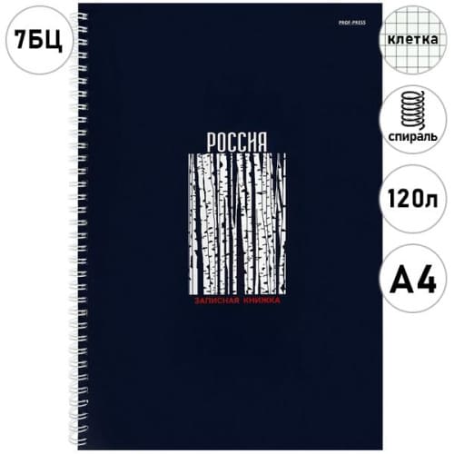 Записная книжка БОЛЬШОЙ ФОРМАТ А4 7БЦ спираль 120л " Проф-Пресс " Березы, клетка, обложка - глянцевый ламинированный картон, 230*300мм