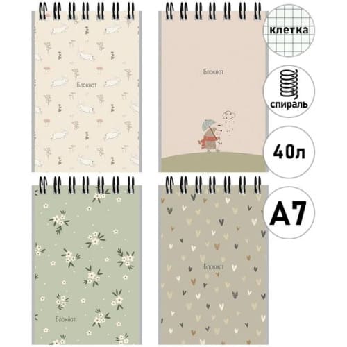 Блокнот МАЛЫЙ ФОРМАТ А7 спираль сверху 40л " Проф-Пресс " Уютный дизайн, клетка, обложка - мелованный картон, 4 дизайна